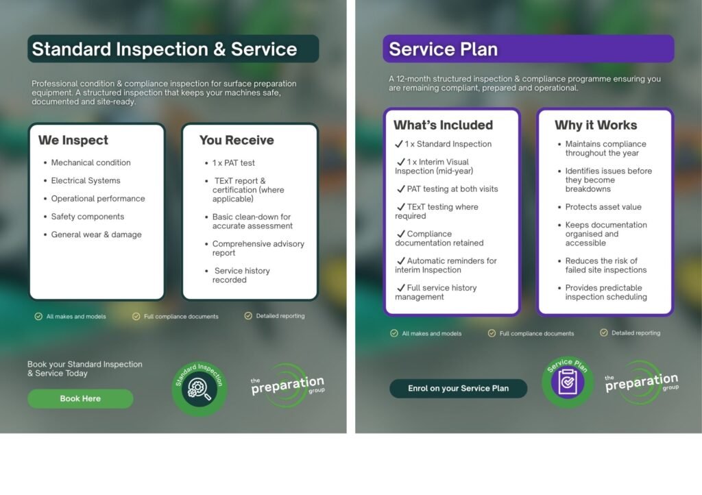 At The Preparation Group, our experts provide standard inspections and servicing on all makes and models of surface preparation, polishing, cleaning equipment and dust extraction.