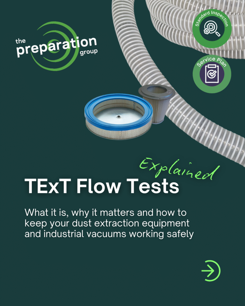 The TExT Flow Test is a practical check used by The Preparation Group during a Standard Inspection and Service to assess whether an industrial vacuum is performing as expected for its intended dust-control setup.
